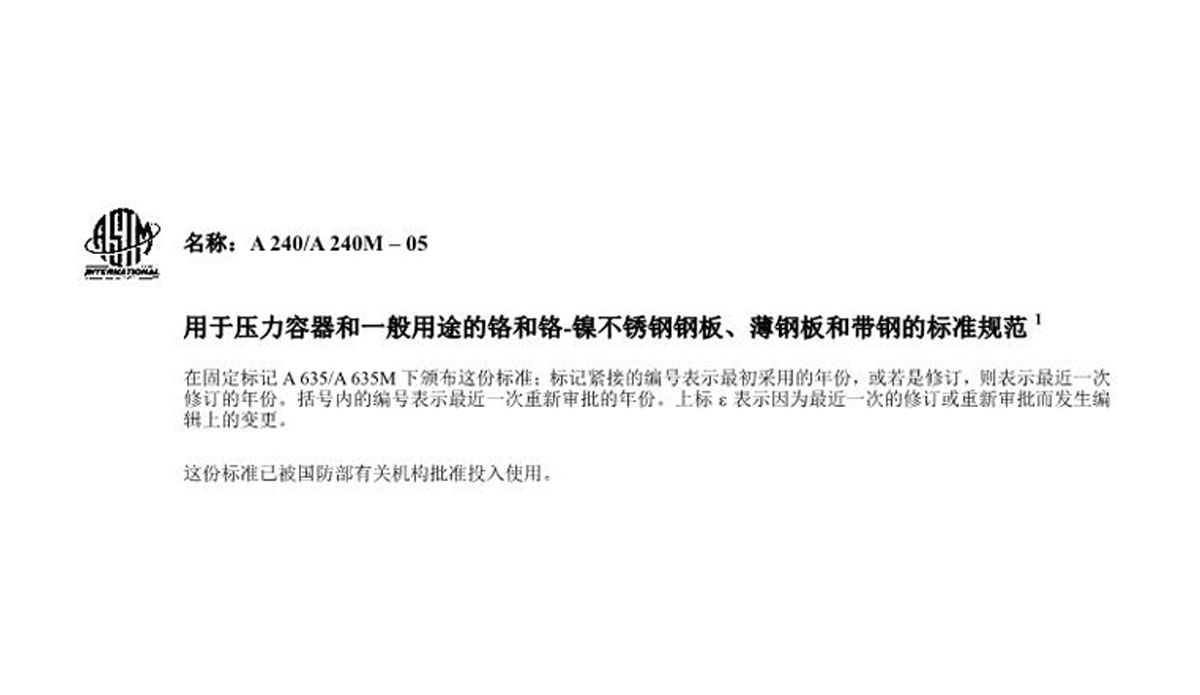 A 240/A 240M – 05 用于压力容器和一样平常用途的铬和铬-镍不锈钢钢板、薄钢板和带钢的标准规范